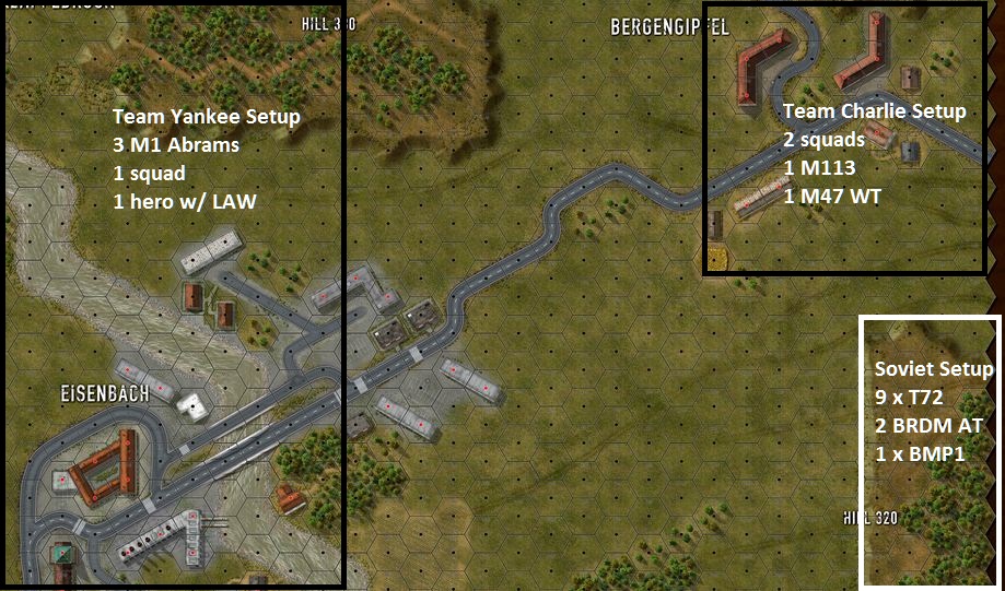 At first, this scenario looks like a cake walk for the Americans as the Soviets have to send masses of armor out into the waiting fire lanes of the Abrams tanks.  However, with the right amount of setup and a very aggressive opening, the Soviet player can pull this one off.Update:  After trying this out a bit more, I can see some problems with the above advice.  First of all, the US units will probably be out of range to return opportunity fire at the ATGM units with their machine guns.  Secondly, the Soviet ATGM units may not be quite the American tank killer I had initially thought.  HEAT missiles that attack vehicles with a red armor factor have their penetration reduced by 4, which means that the penetration of the Soviet BRDM ATGMs is a meager 12 – still a threat that might shake up the Abrams but probably not potent enough to score kills.As a result of all this, I would modify my advice as follows:  The Soviets should sink their two off-board smoke artillery just to the west of Bergengipfel and then fire their HE artillery just to the northeast of Eisenbach.  The latter might be effective in blocking the American Abrams LOS to the Soviets as they move off Hill 320 in the initial impulse.  This should effectively protect the Soviet tank rush as it pours towards Eisenbach.My basic advice of keeping your units together and in command range of the leader, using smoke and artillery to block LOS and rushing your tanks as close as possible to Team Yankee in the opening turn remains the same.