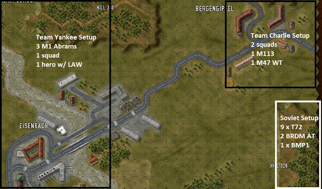 Also, even if the Americans win initiative on Turn 2, they will be forced to choose between targeting your Soviet tank leader, adjacent enemy units and any remaining ATGM vehicles sitting back on Hill 320.  In the picture above, Capt. Bannon will likely activate himself and the adjacent M1, hit the Soviet leader tank (scoring a kill) and then the adjacent M1 will kill one of the T-72s sitting beside it.  Big deal. That still leaves 7 tanks to contend with at close range.  The Soviet player can then spend the rest of the turn assault moving the rest of the T-72s adjacent to the rears of the M1s and firing at them point blank (save one or two tanks for opp fire on any US units foolish enough to try and reach Eisenbach).If the Soviets win initative, fire at the US leader tank with your ATGM unit and then use the next Soviet impulse to activate your leader and the surrounding Soviet tanks to kill it.