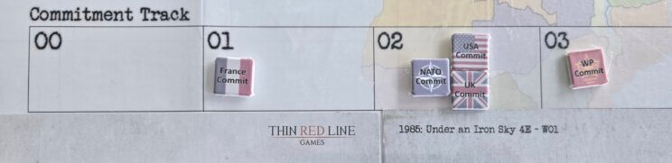 3. NATO may now choose which cards to play, but NO CARDS can be played at Tension Level 0 (the lowest is card E01 – Warning Signs, which can be played at Tension Level 1 or higher).